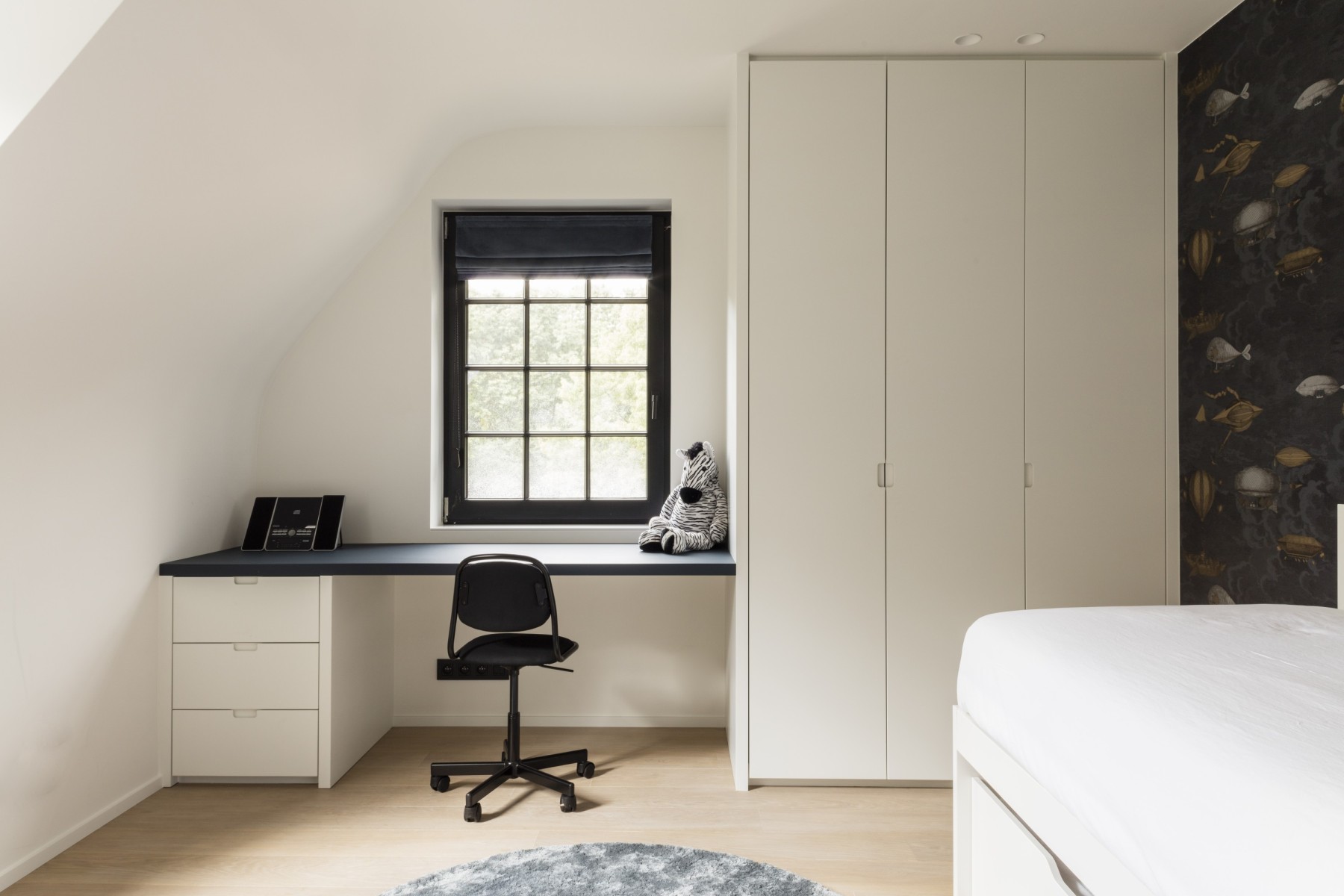 In de master bedroom genieten de bewoners evenzeer van een onbelemmerd uitzicht op de tuin en de groene omgeving. Op verzoek van de bewoners werd deze luxueuze slaapkamer op het gelijkvloers gebouwd. Een keuze die veel bijval kreeg van de kinderen, want zo is de volledige bovenverdieping nu voor hen. Wanneer je vanuit de slaapkamer richting de voorgevel loopt, kom je in de woonkamer. Met een haard en zacht binnenvallend daglicht is dit een knusse cocon waar het gezin volledig tot rust kan komen. Het zorgvuldig geselecteerde high-end design, in een kleurpalet dat perfect is afgestemd op het interieur, draagt bovendien bij aan een aangename en natuurlijke beleving van de ruimte.