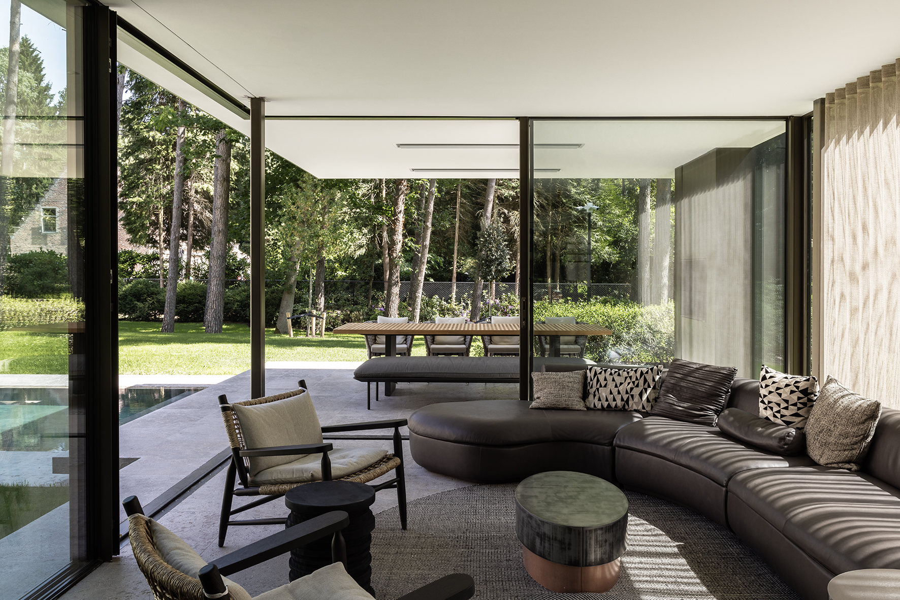 We make a final stop at Residence ST's pool house. With a modest nod to Mies van der Rohe's Barcelona pavilion the architects opted for a sleek design, Pierre de Varennes natural stone finish and bronze accents in the roof support. The garden pavilion includes a kitchen, bar and seating area with the signature high-end furnishings that make Mieke Van Herck's residences so unique.