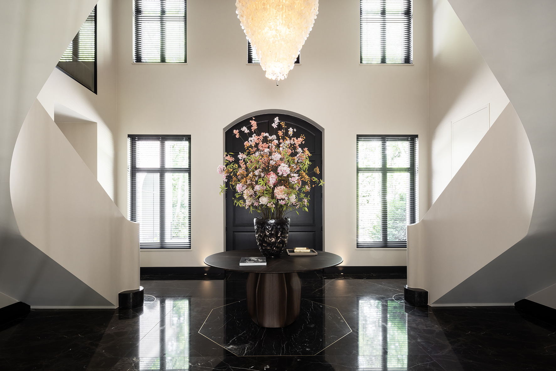 Whereas the builder's foreign career was about to come to an end, the team of Mieke Van Herck architects started with the design of Residence ST in Belgium. A monumental entrance hall with double staircase was the starting point and heart of the entire concept. The interior of the stately villa was also decorated entirely and down to the smallest detail: from the furnishing with renowned design (by Minotti inside and Tribù outside, among others) to the functional equipment with bed and bath linen, kitchenware, etc.