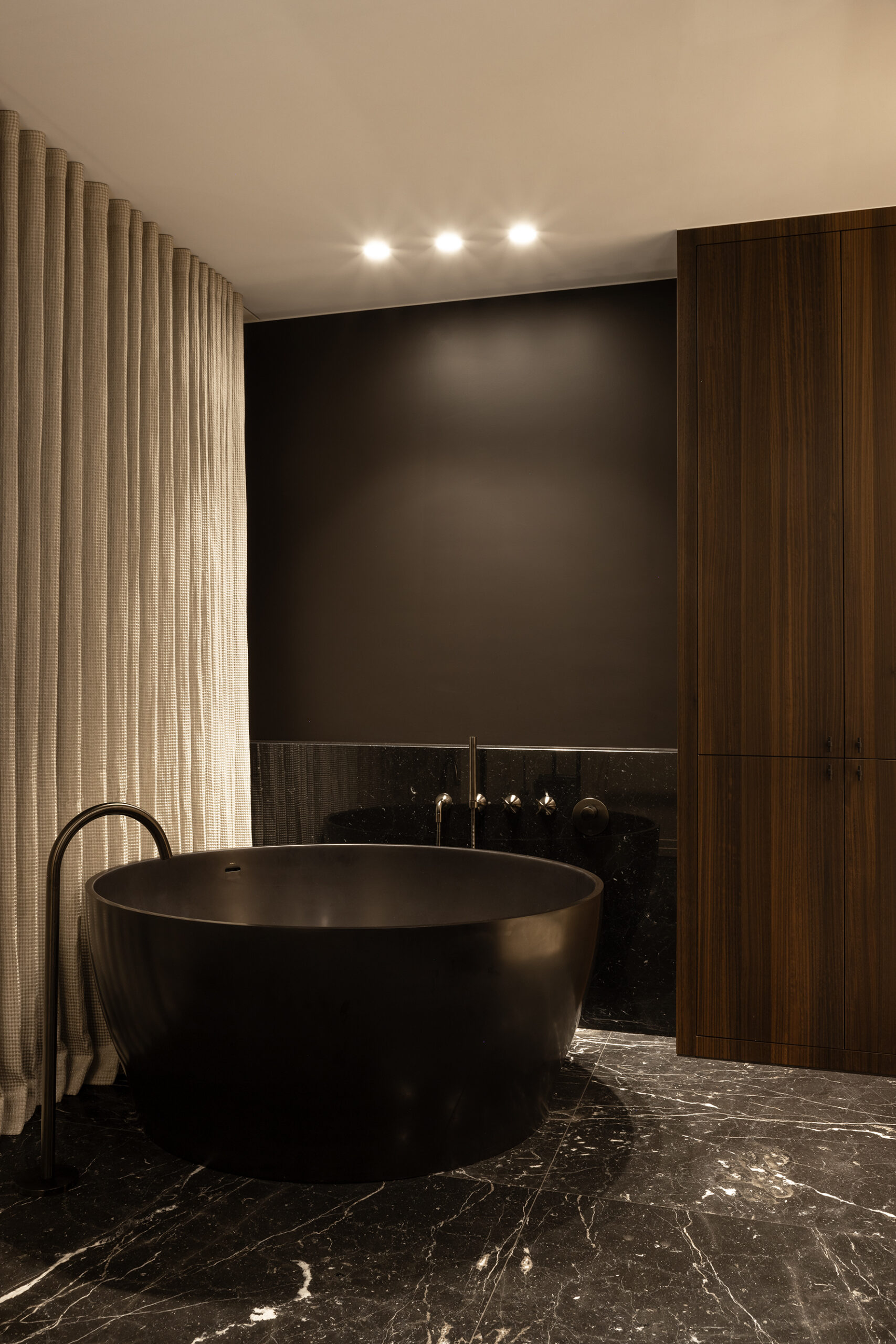 Characteristic of Residence ST is how authentic and natural materials such as natural stone make their way throughout the house. They are also found outside. Only in the children's room the team wisely chose ceramic materials instead. Without detracting from the contemporary language of form, the family requested that a number of classic style elements that are currently making a comeback would be incorporated, such as mouldings, skirting boards and high ceilings. In terms of colour, the architectural team delved a little deeper than usual into the dark palette, opting for several warm versions of taupe, the favourite colour of the lady of the house.